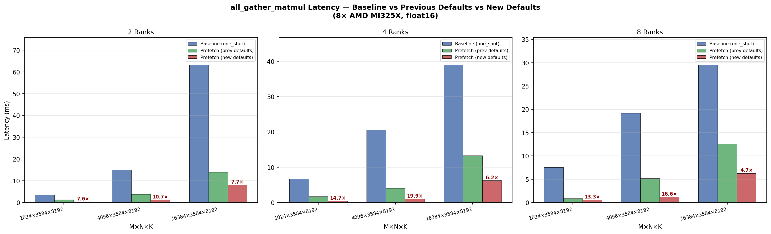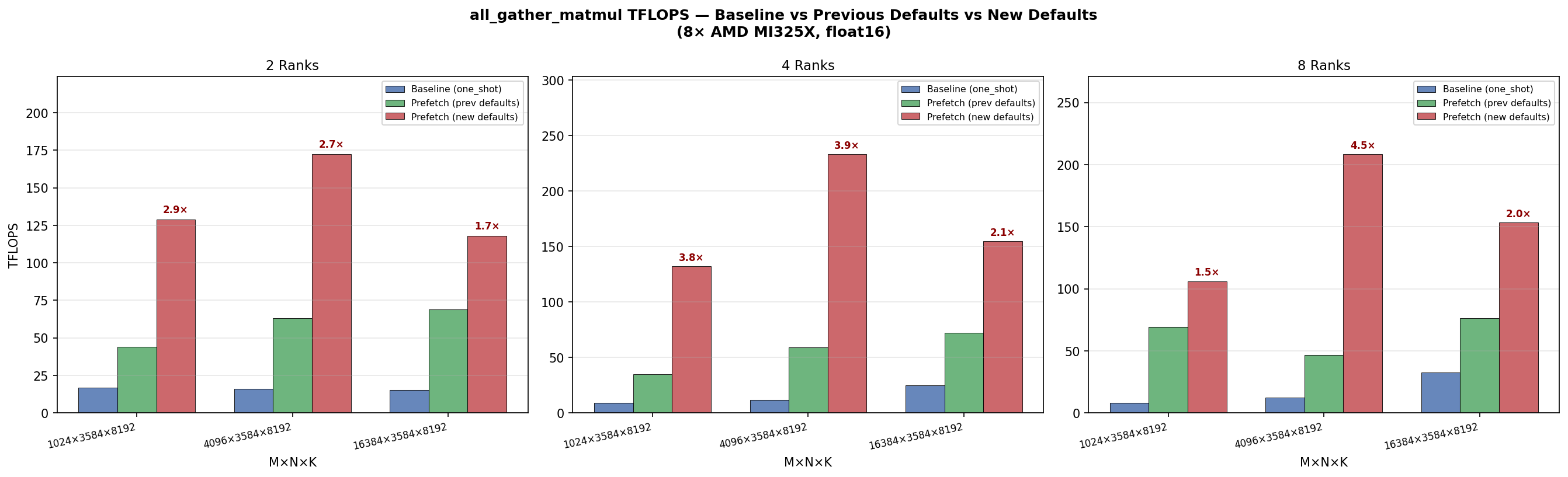 Defaults updated in commits 292ee11 and 6979787. Final defaults: Results on 8× AMD MI325X (gfx942), float16, N=3584, K=8192: 2 Ranks